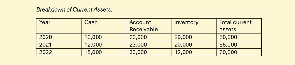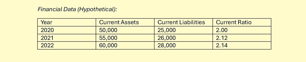 Let’s consider a hypothetical Company, which operates in the manufacturing industry. We will analyze its financial statements over three consecutive years (2020, 2021, and 2022) using the current ratio.